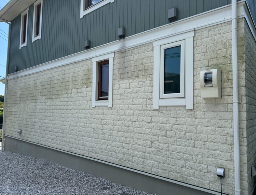 築4年半ですが、藻とカビが付着し、1階部分の白い外壁は以下の写真のようになりました。山間に住んでいるので、ある程度は仕方ないと思っていましたが、東面と北面は、白い外壁が本当に真みどりになりました。1階部分は石目調のサイディング外壁で、新築時にはメンテナンスのことなど考えておらず、デザイン重視で選んだものです。表面がザラザラしているので、余計に汚れが付着しやすいのだと思います。
